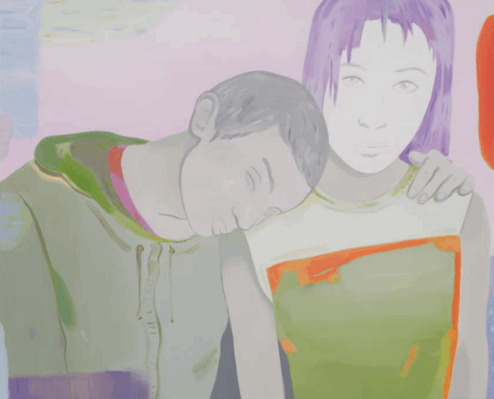Chez Guerlain, dans l’exposition collective « En plein cœur », Françoise Pétrovitch présente un tableau où deux adolescents s’enlacent, suspendus dans un moment d’intimité fragile. Sur une nuée rose, légèrement troublée de vert et de bleu, deux figures se tiennent. L’un, les yeux clos, s’abandonne à l’autre qui, tête levée, regarde le spectateur. Ce face-à-face silencieux met en scène une tension affective centrale : celle d’un amour naissant, à la fois tendre et inquiet. À découvrir, jusqu’au 16 novembre 2025.