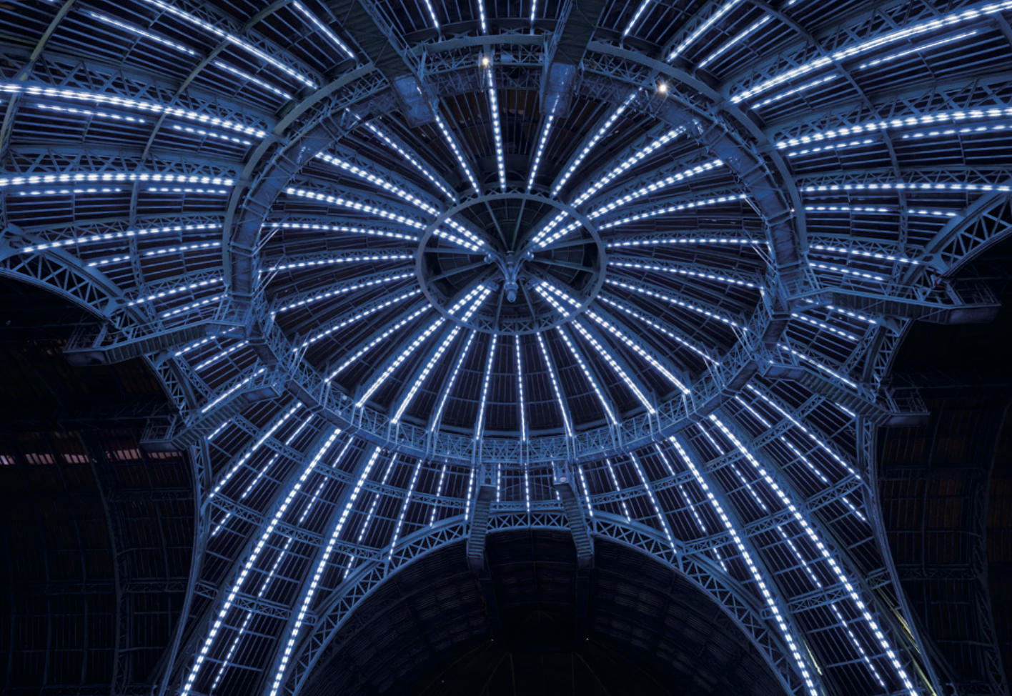 La prouesse technique réside dans l’intégration de 1600 barres LED réparties sur 64 arcs, épousant la logique existante des poutres et soulignant les intersections des pylônes. L’ensemble forme un maillage rythmé, pensé pour générer un motif enveloppant et modulable. Ici, rien n’est décoratif : chaque ligne lumineuse prolonge la structure, la révèle au lieu de la recouvrir. Le dispositif fonctionne avec un système de contrôle ergonomique capable d’adapter les scénographies aux usages — performance audiovisuelle, déambulation contemplative, événement monumental. L’installation pourra se transformer en spectacle immersif de plusieurs dizaines de minutes, avec un univers sonore associé, ou se réduire à un souffle lumineux discret.