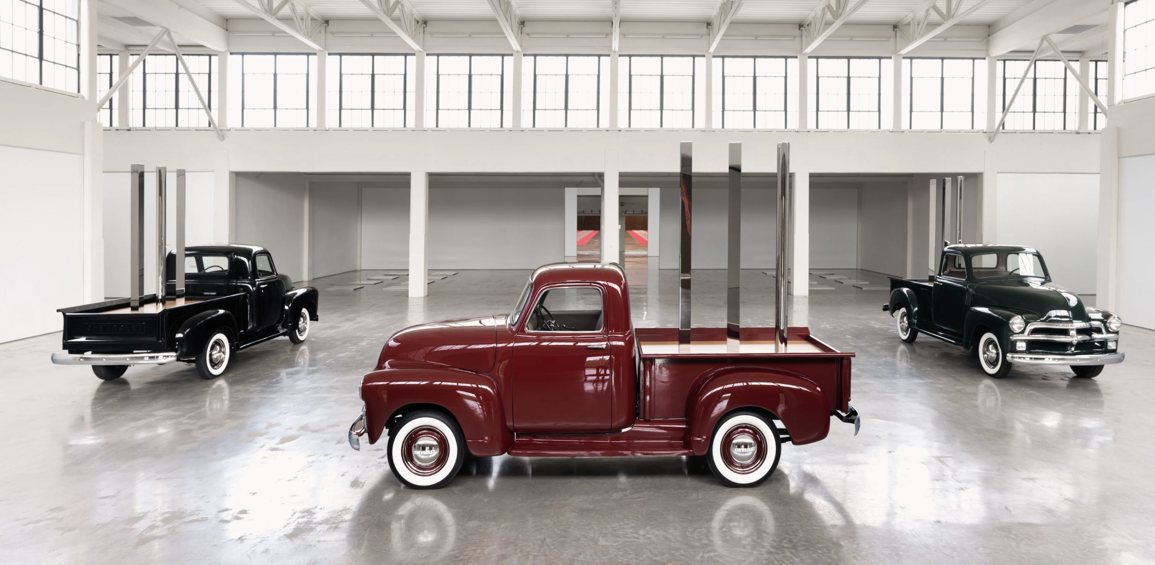 À la galerie Gagosian du Bourget, une exposition exceptionnelle met en lumière Walter De Maria, figure majeure du Land art et du minimalisme, en exposant pour la première fois en Europe sa dernière œuvre, Truck Trilogy. L’artiste, qui aurait eu 90 ans en octobre, transforme ici trois pickups Chevrolet des années 1950 en sculptures monumentales. Plus qu’une exposition, The Singular Experience apparaît comme une traversée : un voyage où l’on change de vitesse, où l’on prend conscience du temps, du rythme et de l’espace.